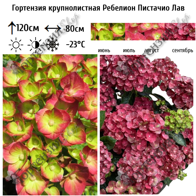 Гортензия крупнолистная Rebellion® 'Pistachio Love' (Пистачио Лав) - очаровательный листопадный кустарник, вырастающий до 1,2 м и шириной до 0,8 м. Листья сердцевидные, с отчетливым кончиком, темно-зеленого цвета. Богатые, сферические соцветия появляются на новых побегах с июня по сентябрь. Это сорт-хамелеон с экзотической расцветкой, Окраска у гортензии Фисташковая любовь динамичная, молодые соцветия имеют фисташково зелёный оттенок, а по мере цветения постепенно окрашиваются в яркий малиново-розовый или малиново-красный цвет. Окраска цветков зависит от PH почвы. Более кислая почва поддерживает окраску цветов в синий цвет, а более щелочная почва способствует розовой окраске. Гортензия умеренно требовательна к росту, но если дать ей благоприятные условия выращивания, она отплатит вам пышным ростом и обильным цветением. На прошлогодней древесине цветет крупнолистная гортензия, поэтому весной мы снимаем только поврежденные морозом побеги. Этот кустарник великолепен в качестве солитера, но он также найдет свое место в саду, на клумбе или на террасе. Идеальный сорт для флористики (долго стоит в срезке).