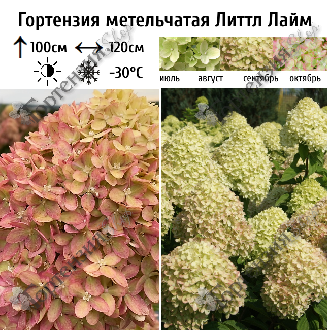 Низкорослый кустарник Литтл Лайм (Little Lime), который во взрослом состоянии достигает около 100 см в высоту и примерно 120 см в диаметре . Побеги у этого сорта прямостоячие, очень крепкие. Листья крупные, матовые, окрашены в зелёный цвет и имеют зубчатые края. По приходу осени листва приобретает пурпурную окраску, что является индивидуальной особенностью данного сорта. Окраска соцветий меняется в зависимости от фазы цветения. В самом начале они светло-зелёные, дальше становятся лимонными и кремовыми, ближе к окончанию цветения приобретают белоснежную окраску, а потом окрашиваются в розовый.