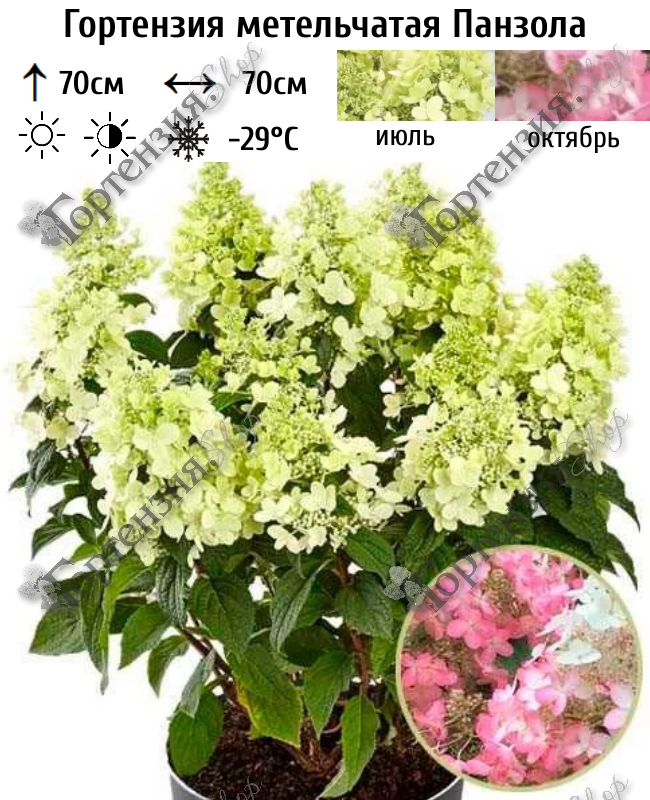 Гортензия метельчатая 'Панзола' - куст компактный, с крепкими побегами, высотой до 70 см, идеален для контейнерных и бордюрных посадок. Очень красивые кружевные ароматные соцветия гортензии Панзола с цветами, похожими на мотыльков, меняют окраску с лимонно-белого на розовый. Стебли прямые, крепкие, не разваливаются и не гнутся под тяжестью крупных, до 20 см, плотных соцветий, которых во время цветения зеленой листвы почти не видно. Ароматный сорт! Насладиться всей палитрой красок можно с июля по октябрь.