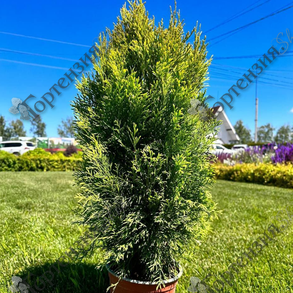 Thuja occidentalis 'Janed Gold' - хвойный вечнозеленый кустарник с пирамидальной кроной, высотой до 6 м, шириной до 1,5 м. Хвоя золотистая, чешуевидная, плотная. Почвы предпочитает влажные, дренированные. Благодаря своей окраски будет ярким акцентом в любом ландшафте, используется в одиночной, групповой посадке, древесно кустарниковых группах и как элемент живой изгороди. Морозостойкость -34С.