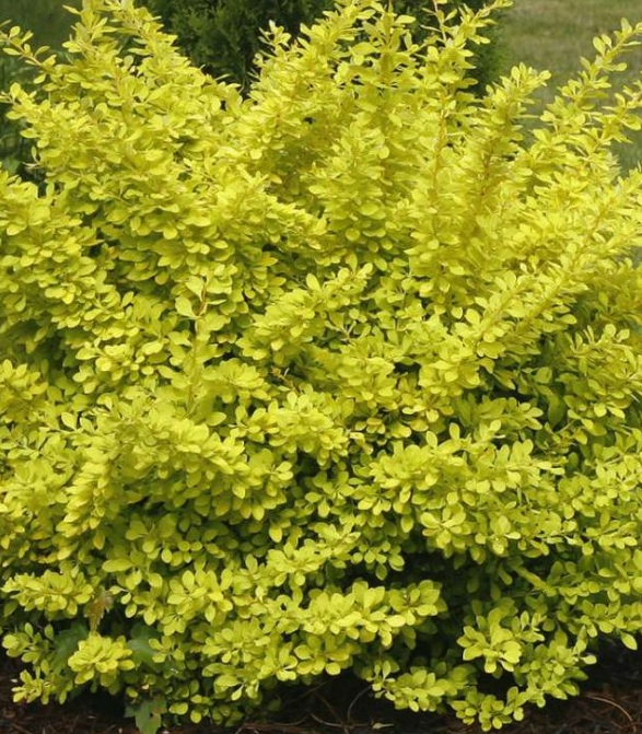 Плотный округлый кустарник до 80см высотой и до 1м в диаметре. Молодые побеги желтовато-зеленого цвета. Листья мелкие, яйцевидные до 2см длиной золотисто-желтые, осенью краснеют, становясь оранжевыми.