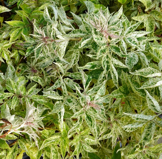 Один из красивых декоративных сортов растения, который часто используют для озеленения участков. Вырастает бузина максимум до 2 м в высоту, но при этом формирует пышную раскидистую крону. Хотя растет куст медленно, диаметр кроны может достигать 1,5 м. Побеги раскидистые, покрытые светло-серой корой. Главное достоинство сорта – эффектная раскраска листьев. Они крупные, перисто-рассеченные. Основной фон представлен в темно-зеленом цвете, а по всей листовой пластине рассыпаны белые пятна. Они могут иметь разную форму и величину, вместе же составляют причудливый рисунок.