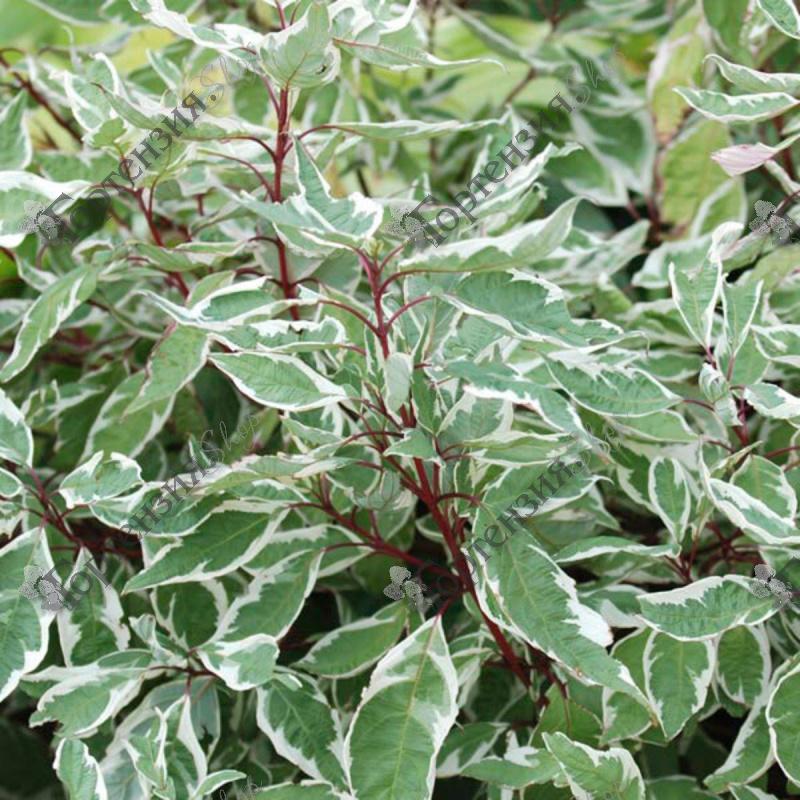 Дерен белый Айвори Хало  (Cornus alba `Ivory Halo`-очень эффектный сорт высотой до 1,5 м. Побеги вертикальные, прочные, красно-коричневого или насыщенного кораллового цвета, особенно в зимний период. Листья овальные, бело-зеленого цвета, пестрые, с обширными белыми пятнами. Осенью окрашиваются в красно-коричневый цвет. Цветет желтоватыми цветками. Быстрорастущий.Теневынослив, но предпочитает солнечные места. Не требователен к плодородию почвы, но предпочитает влажные, дренированные почвы. Не терпит застоя влаги. Зимостойкость очень высокая. Хорошо переносит условия города. Устойчив к повреждению болезнями и вредителями. Ярко окрашены только однолетние и двухлетние побеги, поэтому для сохранения декоративного эффекта рекомендуется омолаживающая стрижка.