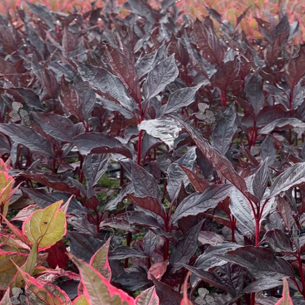 Дерен белый Найтфолл (Cornus alba Nightfall) Сорт уникален своей неповторимой интенсивной зелено-бордовой окраской. Высота взрослого растения 170 см. Листья темно-зеленые с бордовым оттенком. В течение сезона приобретают более интенсивный окрас. Побеги красные прочные . Цветет  в мае - июне белыми цветами в зонтичных соцветиях, позже созреают не съедобные белые плоды 5-7 мм. Сорт дерена Найтфолл выдерживает яркое солнышко, так как в тени окрас будет не ярким. Нетребователен к почве, предпочитает влажную землю. Хорошо переносит щелочную почву. Зимостойкость - 34. Используют для  живой изгороди и в групповых  посадках.