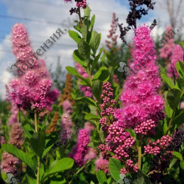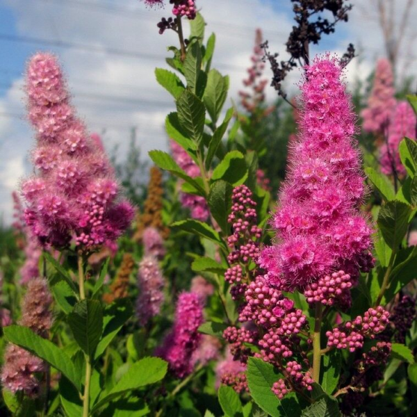 Спирея Билларда Spiraea Billardii - гибридный сорт спиреи иволистной. Это высокий куст до 2,0 м с длинными, прямыми, раскидистыми ветвями. Молодые побеги тонкие, покрыты листьями по всей длине, растут вертикально.Листья зеленые,к осени становятся буровато-красными. Цветки мелкие, приятного ярко-розового цвета со сладковатым ароматом образуют узкие густые метельчатые соцветия. Цветет со второй половины лета до поздней осени. Светолюбивое, засухоустойчивое выносливое растение. Отличается чрезвычайной зимостойкостью. К почвам не требовательна, растет практически на любых. Не любит застойного увлажнения. Теневынослива, но гораздо лучше цветет на солнечных участках. Растет очень быстро. Укрытия на зиму не требуется.
