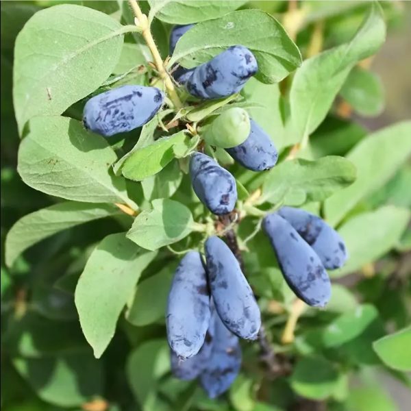 Плоды цилиндрической формы темно-синего или фиолетового цвета. Размер ягоды 1,5-2,2 см в длину, вес до 1,8-2 г. Кожура тонкая, с матовым налетом. Мякоть плотной структуры, имеет кисло-сладкий вкус без горечи. Урожайность сорта «Васюганская» до 3-4 кг с одного взрослого куста. После созревания ягоды осыпаются.